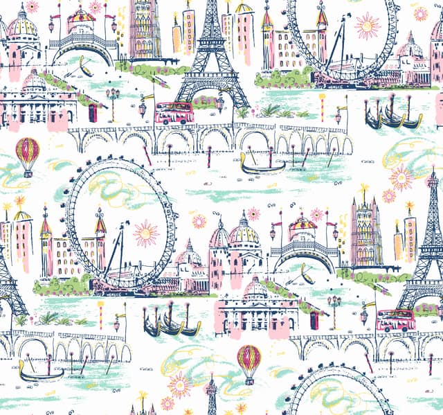 Wyjątkowa tapeta z kolekcji A Perfect World autorstwa amerykańskiej firmy York Wallcoverings inspirowana podróżą po Europie. Londyńskie Oko, wieża Eiffla, weneckie gondole i inne zabytki - jest to kolorowe zaproszenie do podziwiania naszego ekscytującego świata.