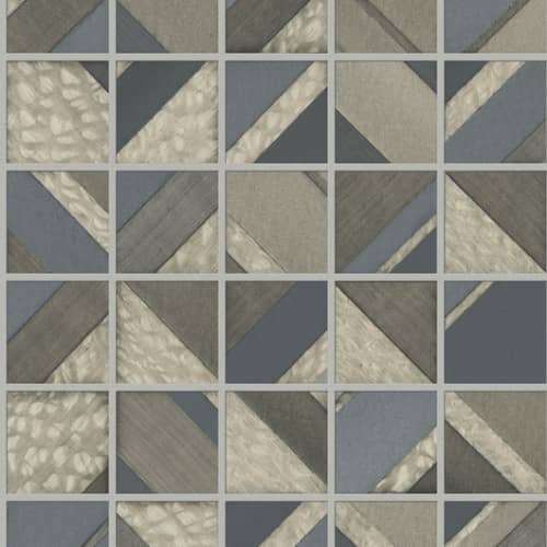 Tapeta MM1751 pochodzi z kolekcji MIXED MATERIALS - ostatniej nowości znanej amerykańskiej firmy YORK. Tapeta przedstawia geometryczny wzór  wpisany w równe kwadraty imitujące płytki. Strukturalne tło, niebiesko - szara kolorystyka, srebrzysty połysk.  Całość niebanalna i efektowna. Tapeta idealna dla lubiących proste, nowoczesne wnętrza i ceniących spokojną elegancję.