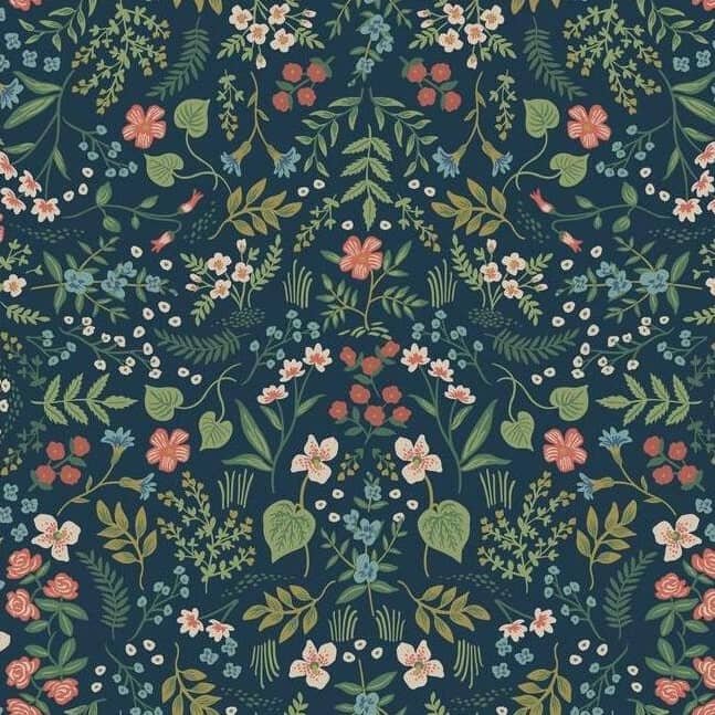 Ciekawy i inspirujący wzór zauroczy miłośników flory. Wyjątkowa tapeta, która pięknie ozdobi ściany salonu sypialni a nawet pokoju dziecięcego. Piękna ilustracja przedstawiające drobne kwiaty autorstwa Anny Bond załozycielki Rifle Paper.Co. Kolorowy motyw drobnych kwiatów na ciemnym granatowym tle będzie pięknym i wyrazistym akcentem we wnętrzu. Tapeta doda elegancji i lekkości.