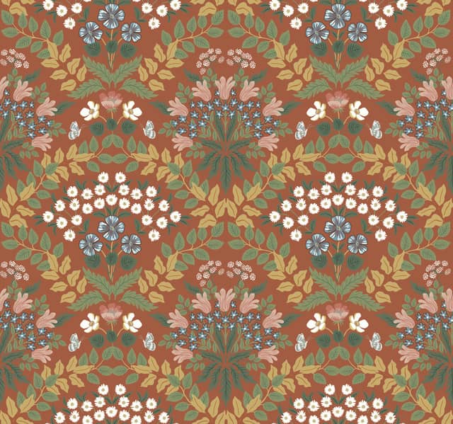 Gęsty gobelinowy wzór przedstawiający kwiaty układające się w szerokie rozłożyste wachlarze. Tapeta zaprojektowana przez znakomitą i cenioną  ilustratorkę Annę Bond załozycielkę marki RIFLE PAPER CO, która w kolaboracji z amerykańskim producentem York Wallcoverings stworzyła piękną kolekcję tapet. Nasycone głębokie barwy. Piękny wzór przedstawiający roślinność. Klasa i ponadczasowa elegancja.