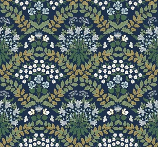 Gęsty gobelinowy wzór przedstawiający kwiaty układające się w szerokie rozłożyste wachlarze. Tapeta zaprojektowana przez znakomitą i cenioną  ilustratorkę Annę Bond załozycielkę marki RIFLE PAPER CO, która w kolaboracji z amerykańskim producentem York Wallcoverings stworzyła piękną kolekcję tapet. Nasycone głębokie barwy. Piękny wzór przedstawiający roślinność. Klasa i ponadczasowa elegancja.